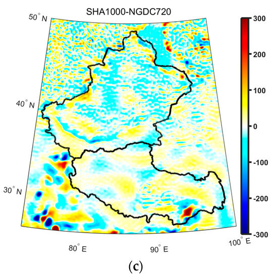 We calculate and illustrate the difference figures among the 3DSS34039, SHA1000, and NGDC720 models in Figure 5 to test the modeling error and to inspect the differences.