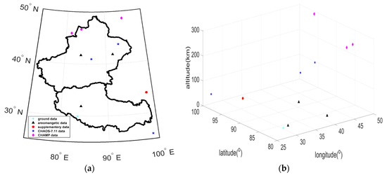 Due to the temporal stability, all available measuring data from 1936.0–1990.0 can be calculated into 2000.0, generating 179 overlap points. We, thus, retained the data that are closer to the corresponding lithospheric field of CM4 [4]. Finally, 519 ground data were selected over Xinjiang and Tibet areas. In order to obtain clean and consistent anomaly data, we uniformly subtracted the main field with degree 10 by IGRF13 [37] from 1936.0 and 1950.0’s points and by CM4 from 1960.0 to 2000.0’s points. In addition, the external noise is seen as the large-scale magnetosphere ring currents and is, thus, eliminated by the CM4 model.
