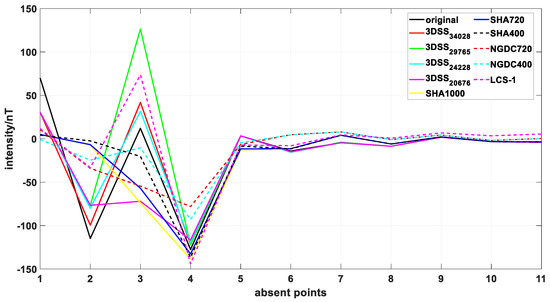 Due to the modeling theory of 3DSS, we abstract 11 3DSS modeling points (Figure 6), one grounded, three aeromagnetic, one supplementary, three CHAOS, and three CHAMP points, randomly according to the percentage of data and then derive the models based on the rest of the data (34,028, 29,765, 24,228, and 20,676 points). Finally, we forward predicted these 11 points to check the RMSE in Figure 7 and Table 2.