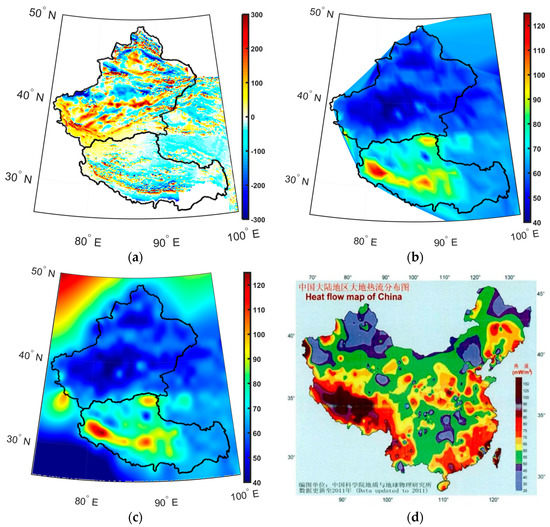 After comparing with Figure 10a, the positive heat flow stripe coincides with the lithospheric field’s positive stripe in southern Tibet. A northward negative part corresponds to the same sign part of the lithospheric field. However, the correlation in Xinjiang needs to be clarified, and there is no obvious heat flow variation.
