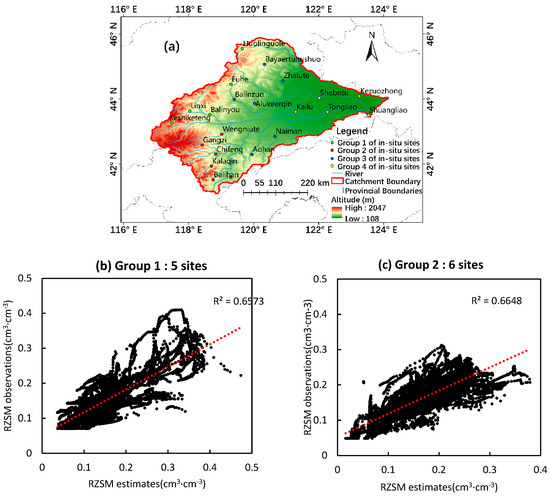 Scatterplots of the root-zone soil moisture observations and estimates during the calibration periods (2016–2020) at each of the four groups of in situ sites in the Xiliaohe River Basin. (a) Locations of the four groups of in situ sites, (b) Group 1, (c) Group 2, (d) Group 3 and (e) Group 4.