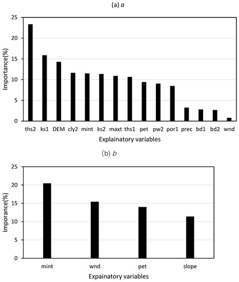 Although the RF model tended to weaken the variation of the SMAR parameters, the relative importance (%) of the explanatory variables in the RF model (Figure 9a–d) still provided a reference to some extent. The water loss efficiency (a) was largely dependent on the saturated water content in the root-zone soil layer (ths2), followed by the saturated hydraulic conductivity in the near-surface soil layer (ks1), which can be explained by the infiltration process of the subsoil. The mean daily minimum temperature (mint), wind speed (wnd), potential transpiration (pet) and slope exerted almost equal influences on the diffusion rate (b). A previous study [28] on the infiltration rate of grassland in arid areas of China showed that soil infiltration rate was negatively correlated with SM and positively correlated with subsurface biomass, which was spatially manifested as a higher infiltration rate in the eastern part of the basin than in the western part of the basin (Figure 5b). Similarly, the mint was higher in the eastern part of the basin than in the western part. Therefore, we guess that mint is not a physical factor that affects soil infiltration rate, and the large influence of mint on infiltration rate b is perhaps due to the spatial similarity between b and mint. For the relative wilting level of root-zone soil (sw2), the slope provided the most importance among all the variables. For the relative field capacity at the near-surface soil layer (sc1), the porosity (por) and saturated water content (ths) in the near-surface and root-zone soil layers were important, with some physical rationality.