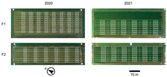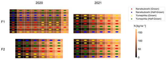 The study was conducted at the cultivation technology development test field (43°10′37″N, 141°43′12″E) of the Iwamizawa Experimental Site, Central Agricultural Experiment Station, Agricultural Research Department, Hokkaido Research Organization in Iwamizawa, Hokkaido, Japan. Rice (Oryza sativa L.) seedlings were transplanted to two adjacent fields (F1 and F2; Figure 1) at intervals of 12 and 11 days in 2020 and 2021, respectively (Table 1). Each field was divided into plots with different combinations of cultivar, seedling raising, and fertilizer application (Figure 2). Each plot was 2 m wide and 8–12 m long, and the plot design varied from year to year. The two major Hokkaido cultivars were cultivated: Nanatsuboshi and Yumepirika. The seedlings were raised to 5–6 true leaves (grown seedlings) and 3–4 true leaves (half-grown). The amount of nitrogen fertilizer applied before transplantation was 0–170 kg ha−1.
