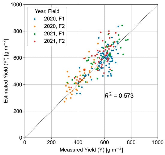where Y′ is the estimated yield per unit area (g m−2), D is the number of panicles per unit area (m−2), N is the number of grains per panicle, R is the percentage of ripened grains (%), and W is the 1000-grain weight (g). The consistency between the measured yield and estimated yield was analyzed using a scatter plot (Figure 3). Although there was variation due to measurement errors, the data were generally consistent.
