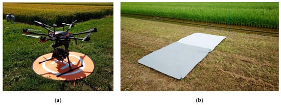 This imager was attached to a gimbal RONIN-MX (SZ DJI Technology Co. Ltd., Shenzhen, China) for stability, which was mounted on a hexacopter type UAV Matrice 600 Pro (SZ DJI Technology Co. Ltd.; Figure 4a). The UAV was manually operated and stopped in the air at a height of approximately 70 m above the center of each field; the imager continuously viewed in the nadir direction. The field of view was approximately 112 × 84 m on the ground, and the spatial resolution was 0.17 m. A standard reflector with known spectral reflectance was placed on the ground in the field of view and used to convert the radiance in each band to reflectance (Figure 4b).