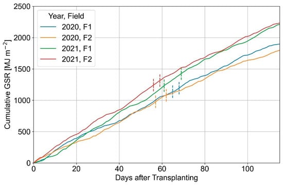 The solar radiation data were obtained from the Agro-Meteorological Grid Square Data of the National Agriculture and Food Research Organization [34,35]. This database provides various meteorological observation data interpolated to a 1 × 1 km grid in Japan. Daily global solar radiation (GSR, [MJ m−2 day−1]) is provided, which is the total amount of solar radiation received by the ground surface or the sum of solar radiation that arrives directly from the sun, and solar radiation that is scattered and reflected in the atmosphere. This was used to plot the time variation of GSR accumulated after transplantation (Figure 5).
