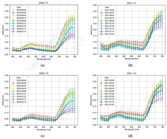 Average reflectance spectra of the (a) F1 field in 2020, (b) F1 field in 2021, (c) F2 field in 2020, and (d) F2 field in 2021. Error bars represent the standard deviation.