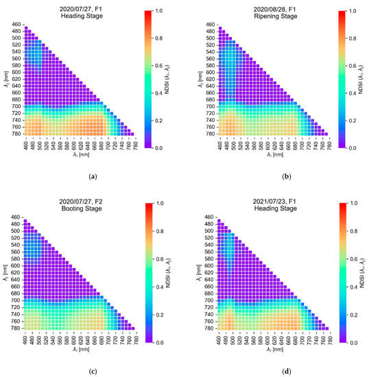 Comparison of the NDSI (normalized difference spectral index) at different growth stages, years, and fields for the same cultivar (Nanatsuboshi), seedling raising (grown seedlings), and fertilizer application (140 kg ha−1); (a) F1 field at the heading stage in 2020, (b) F1 field at the ripening stage in 2020, (c) F2 field at the booting stage in 2020, and (d) F1 field at the heading stage in 2021. The horizontal and vertical axes are the wavelengths corresponding to λi and λj of the NDSI (λi, λj), respectively.