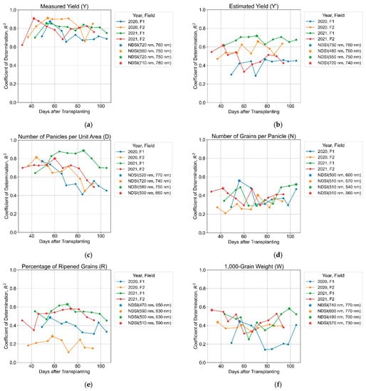 Time-series variations of the highest value in the coefficient of determination, R2, for prediction of (a) measured yield (Y), (b) estimated yield (Y′), (c) number of panicles per unit area (D), (d) number of grains per panicle (N), (e) percentage of ripened grains (R), and (f) 1000-grain weight (W) with respect to the number of days from transplantation. The highest R2 in the entire period and its wavelengths of the NDSI are highlighted with stars.
