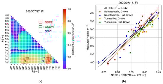 (a) Heat map of the coefficient of determination for the NDSI yield in F1 on 17 July 2020. The areas surrounded by the dotted rectangles are the combination of spectral bands corresponding to the vegetation index of the NDRE (normalized difference red-edge index, red), GNDVI (green normalized difference vegetation index, green), and NDVI (normalized difference vegetation index, blue), and their representative bands (solid line). (b) Relationship between the NDRE and measured yield. The black line is the regression line from the data of all plots, and the colored line is the regression line for plots with different combinations of cultivars and seedling raising.