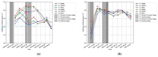 Time-series variations in the coefficient of determination of each vegetation index with respect to the measured yield for each field in (a) 2020 and (b) 2021.