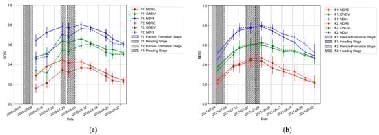 The NDSI values are largest for the NDVI, followed by GNDVI and NDRE (Figure 11). All of the indices increase from the panicle formation stage to the heading stage, then plateau between 7 and 10 days after heading, and gradually decrease during the ripening stage.