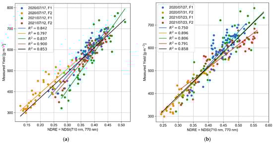 The combination of spectral bands with a high prediction accuracy for the measured yield is (1) the combination of λj = 750–780 nm in the near-infrared region and λi = 700–720 nm in the red-edge region, followed by (2) the combination of λj = 750–780 nm in the near-infrared region and λi = 530–570 nm in the green region. When these combinations are compared with the vegetation index conventionally used in multispectral observations, (1) and (2) correspond to NDRE [36] and GNDVI [37], respectively. The NDVI [38] is the most widely used vegetation index in remote sensing corresponding to the combination of λj = 750–780 nm in the near-infrared region and λi = 650–680 nm in the red region (3). However, it has a relatively lower prediction accuracy than (1) and (2). For example, a heat map of the NDSI R2 value for the measured yield on 17 July 2020 had the highest prediction accuracy in the F1 field in 2020 (Figure 9a). The R2 values for (1), (2), and (3) are in the range of 0.75–0.85, 0.65–0.75, and 0.55–0.65, respectively. The R2 variation in the regions corresponding to the three vegetation indices of NDRE, GNDVI, and NDVI on the heat map is relatively small (≤0.05). Therefore, NDRE = NDSI (710 nm, 770 nm), GNDVI = NDSI (550 nm, 770 nm), and NDVI = NDSI (670 nm, 770 nm) are defined as combinations of spectral bands that represent the three indices for simplicity. The regression lines indicating the relationship between NDRE and the measured yield are nearly identical when comparing plots with different combinations of cultivars and seedling raising (Figure 9b).