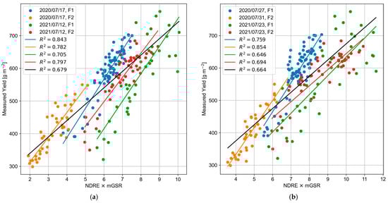 Relationship between the NDRE × mGSR and the measured yield during the (a) booting stage and (b) heading stage.