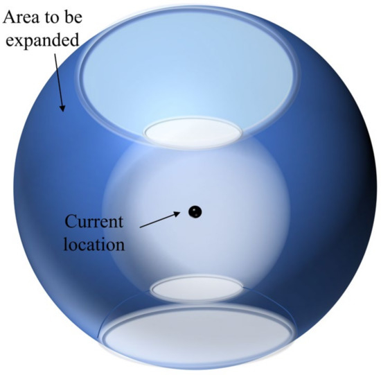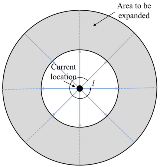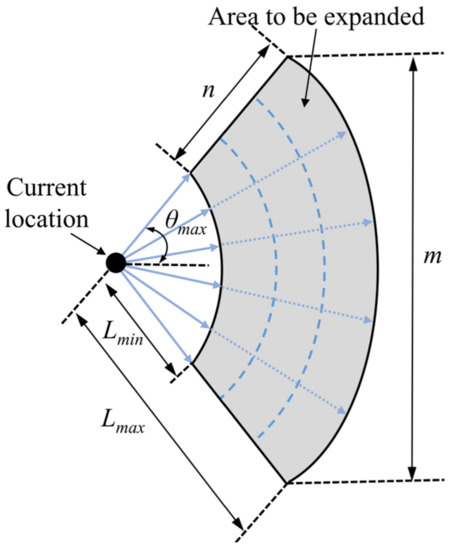 When establishing the area to be extended for UAVs, the constraints of UAVs need to be considered simultaneously, including the maximum movement step , minimum movement step , maximum pitch angle , minimum flight height , and minimum collision avoidance distance between two UAVs. According to the current position of the UAVs and the constraints, the path planning process is as follows.