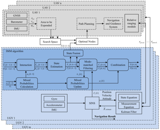 For the whole cooperative navigation system, each UGV calculates its position by IMU and fuses the cooperative information from UAVs by the Kalman filter. At the moment, the UGVs need to predict their position at the moment by the IMM algorithm; so as to judge the position that UAVs should reach when the sum of GDOP corresponds to all UGVs at the moment is the smallest; so that the configuration of the whole cooperative navigation system can be adjusted in real-time to provide the UGVs with the optimal cooperative information. Therefore, the cooperative navigation algorithm proposed in this paper is divided into three main parts: position prediction of UGVs, cost function calculation and optimal position selection of the high-altitude UAVs, and inertial/co-ranging value fusion of UGVs.