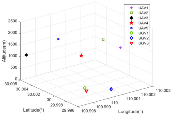 Based on the UGVs’ location predicted by Equation (10), all node combinations in the search space are traversed, and the corresponding generation value is calculated according to Equation (17) to find the least costly node combination as the location where the UAVs should arrive at the moment.