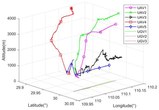 The UAVs continuously broadcasts range measurement signals and position information during flight. After receiving the signals and decoding the distance, the UGVs can fuse and filter them with their inertial guidance information according to Equations (21) and (22). It is worth noting that the filtering frequency need not be consistent with the frequency of the UAV path planning, and the frequency of the UAV path planning can be reduced in order to reduce the computation.