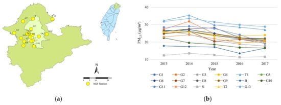 Study area and PM2.5 monitoring stations. (a) Locations of the study area (Taipei Metropolis) and PM2.5 monitoring stations. (b) Time series of the PM2.5 concentrations from 2013–2017 (17-monitoring stations).