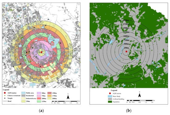 Buffering analyses with a radius that ranges from 250 m to 2000 m within Taipei Metropolis. (a) Buffering analyses using the potential predictors from a geographic dataset. (b) Buffering analyses using satellite image dataset.
