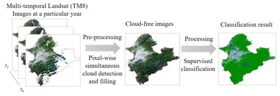 Workflow of cloud-free image generation and classification. This process involves multiple steps, including image acquisition, pre-processing and analysis, n represents the number of used images.