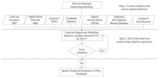 The main idea of this study is to integrate the geospatial data, which contain land use, landmarks, digital road networks, and digital terrain models (DTM), and the optical satellite data, which contain NDVI and land cover classification, in the modeling of PM2.5 concentrations. This integration can complement the advantages in the geospatial datasets and remote sensing images. The study proposes the use of a Landsat-8 operational land imager (OLI) sensor instead of MODIS because of its higher 30 m spatial resolution, which improves the classification of small objects. In addition, cloud pixels of a satellite image on a particular acquisition date are masked out and replaced with the spectral information of corresponding pixels from other acquisition dates to generate a cloud-free image. Thus, the proposed method provides the following contributions: (1) the integration of satellite images with a geographic dataset, which provides suitable temporal and spatial resolution land use information and contributes to PM2.5 concentration estimation; and (2) the generation of cloud-free images, which enables the classification of land covers without missing regions. The remainder of this paper is organized as follows. Section 2 introduces the study area and datasets, and Section 3 proposes the methodology. Section 4 shows the experimental results, and Section 5 provides the conclusions.
