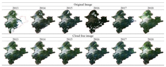 One of the main challenges for satellite image applications is the existence of cloud cover that hinders partial ground information. To address this issue, several cloudy images are merged to generate a near cloud-free image. Figure 5 shows the original satellite images and cloud-free images that were acquired from 2013–2018, in which cloud cover was spotted at several places. High coverage of clouds can be found in the images of 2013, 2014, and 2016. Therefore, three satellite images were used in each of these years to obtain cloud-free images with satisfactory results, and only two images were utilized for the generation of cloud-free images in the other years. With a simple merging strategy, the cloud cover is significantly reduced, and near cloud-free images are generated.