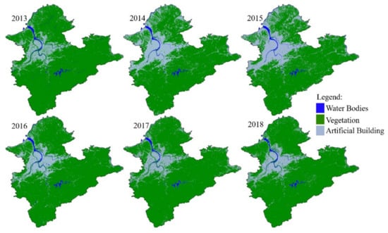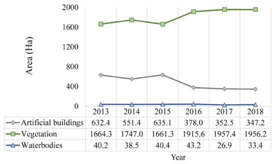 The near cloud-free images were used to extract land use information in Taipei Metropolis by using maximum likelihood classification. The selected land use types are water bodies, vegetation, and artificial building. The training and testing sets for the classification were determined by using manual visual selection. Figure 6 shows the classification results, and Figure 7 presents the trend of land use coverage changes in terms of total coverage area in the unit of Ha during 2013 to 2018. The results show that the coverage of artificial buildings is gradually decreasing, whereas that of vegetation is gradually increasing, except for the year 2015. This phenomenon may be caused by several parks that were created during those six years. As for the cover of water bodies, the total coverage area slightly decreased.