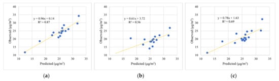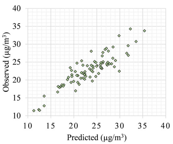The adjusted R2 = 0.72 implies that the final model has a high positive correlation with the PM2.5 concentrations. The regression coefficients of the predictors and are 0.01 × 10−3 and 0.71 × 10−4, indicating that the PM2.5 concentration is increased by 0.01 × 10−3 µg/m3 when the area inside the circular buffer with a radius of 2000 m is all artificial building, and is decreased by 0.71 × 10−4 µg/m3 if the land use class is pure residential in a circular buffer with a radius of 500 m. Moreover, the PM10 concentration can dominantly explain the variation in PM2.5 concentration because the partial (part.) R2 is 70.7%. For the other selected predictors, such as , wind speed, the SO2 concentration, and , the part. R2 is 21.2%, 12.2%, 7.4%, and 0.7%, respectively. In addition, the R2 of the developed model is 0.85, and the scatterplot of the observed and estimated PM2.5 concentrations is shown in Figure 8.