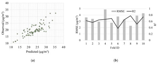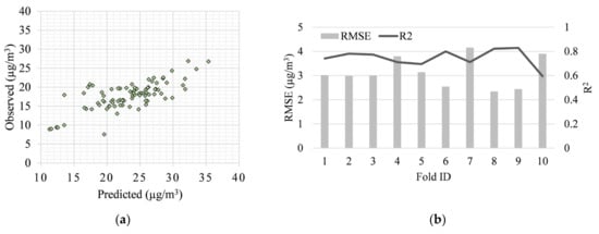 External verification using the PM2.5 data of the year 2018. (a) Observed (y-axis) and estimated (x-axis) PM2.5 concentration from Model B. (b) Accuracy assessment using tenfold cross-validation scheme.