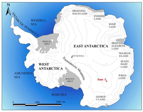 The pseudo-invariant calibration site Dome C (75.1°S, 123.4°E), shown in Figure 2, is located in the Eastern Antarctic Plateau. It features a high altitude (~3200 m), uniform land surfaces with snow and ice, and a slight surface slope, which shows a negligible effect on BRDF and viewing reflectance uniformity. The stable atmospheric conditions feature as cold, dry with consistently less cloud cover, and least affected by cloud cover [16]. The location is far from the coast (>1000 km), and the atmospheric aerosol and water vapor content are low. These factors can reduce the radiance uncertainty to the minimum (less than ±2%) [9]. All things indicate that Dome C is very suitable as a calibration site for the ultraviolet and visible channels observation.
