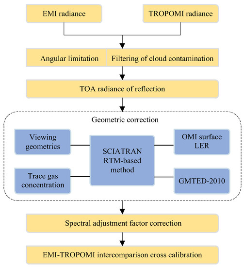 Flowchart for cross-calibration of EMI-2 to TROPOMI based on RTM method.