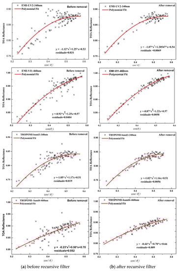 Figure 5 shows the polynomial relationship between the TOA reflectance and SZA(cos θs) for EMI-2/TROPOMI. On the left, the four figures represent the results before filtering, while on the right side, the four figures represent the results after filtering. The data of 340 nm of the UV2 band and 460 nm of the VI1 band are selected for comparison. It can be seen that most of the outliers in the left figures are significantly removed, as shown on the right side correspondingly. Through this recursive filtering method, about 13% of EMI-2 and 8% of TROPOMI outliers can be screened out.