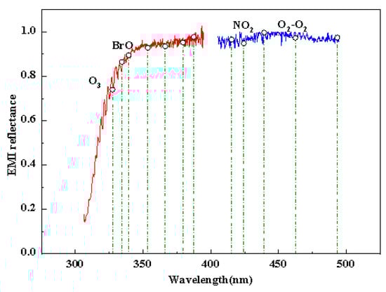 In this paper, the TOA radiance of reflectance validation was performed for a selection of two bands with 12 central wavelengths (shown in Figure 6). Figure 6 presents the TOA reflectance measured by EMI-2 over Dome C on 8 November 2021 with no clouds present. The positions of the 12 central wavelengths were indicated with dotted lines. These wavelengths also cover the corresponding spectral range of EMI-2 as much as possible to promise minimal interference from the surrounding absorption bands, which are labeled with corresponding trace gases [3]. Due to the large time span between EMI-2 and TROPOMI calibration, the reflectivity below 325 nm is strongly dependent on the ozone profile [23]. Considering that the variation of Antarctic ozone content with time will greatly affect the accuracy of the calibration, the shortest wavelength listed is set at 328 nm.