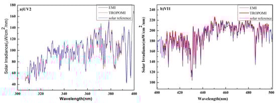 where and are the solar irradiance measurements of EMI-2 and TROPOMI, respectively, which could be calculated as the right side of the Equation (5). and represents the instrument spectral response function (ISRF) of EMI-2 and TROPOMI, respectively, and is the wavelength under specific bandwidth. is the high-resolution solar spectrum from the SAO2010 solar irradiance reference spectrum. Then, the SAO2010 solar irradiance reference spectrum is convoluted with the ISRF of two sensors. After the convolution, the resulting spectra are pixel sampled to match the axis.