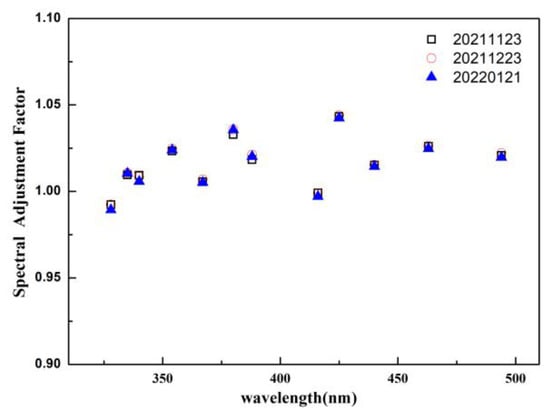 To perform an accurate cross-calibration between these two sensors, the differences due to spectral responses need to be understood and quantified. Because the Sun is regarded as a relatively stable light source, the measurement of solar irradiance provides a stability reference. Similar to the calculation principle of the SBAF factor [24], the spectral adjustment factor Aλ between EMI-2 and TROPOMI can be characterized by the solar spectra measured by itself, as shown in Equation (5).