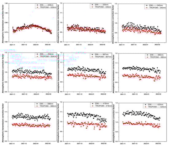 As shown in Figure 9, at 328 nm, 335 nm, and 340 nm, the atmospheric transmission correction factor series of EMI-2 and TROPOMI almost overlap, but the deviation from the theoretical values obtained by the SCIATRAN model is relatively large (far away from one). At 328 nm, the bias ranges from −0.3 to −0.2, which is much larger than those of 335 nm and 340 nm. This may attribute to the fact that the atmosphere is very sensitive to the influence of the surrounding light transmission in this band (328 nm); the influence of molecular scattering and aerosol on light transmission is easily affected by the Sun and observation geometry. On the other hand, it may be that the radiance signal at this wavelength is a little weak and very sensitive to the changes in the radiation signal [6].