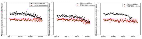 The atmospheric transmission correction factor fλ according to Equation (6) is a typical way to eliminate the difference due to the atmosphere on Earth sensor and the difference in view geometry. Figure 9 demonstrates the time series of atmospheric transmission correction factors of EMI-2 (Black) and TROPOMI (Red) relative to theoretical reflectance calculated with SCIATRAN while data filtering and VZA/RAA limitations are involved. It indicates that EMI-2 is deviated slightly heavier than TROPOMI, about 2% to 3%, except for 416 nm, 425 nm, and 440 nm, which demonstrate large biases on the order of 4% or more, and this is inconsistent with the solar irradiance measured by EMI-2 that is larger than that measured by TROPOMI shown in Figure 8. Similar to UV2 bands, VIS bands also suggest consistently lower values responsible for TROPOMI compared to EMI-2. The temporal trends for bias are nearly unchanged.