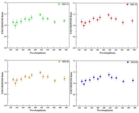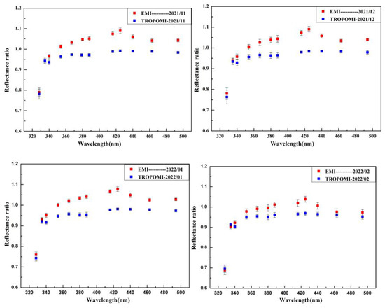 Figure 12 shows the mean and standard deviation of the monthly reflectance ratio of EMI-2 to TROPOMI after spectral adjustment factor and RTM correction. The standard deviation of normalized TOA reflectance represents the uncertainty of radiometric calibration, and the change in mean value represents the stability of radiation response. As shown in Figure 12, the standard deviation is less than 3%, which conforms to the variation scope of Antarctic ice and snow reflectivity, and the instrument radiance signal is stable [13]. The reflectance ratios of EMI-2 to TROPOMI range from 0.998 to 1.09. For 328 nm, 335 nm, 340 nm, 460 nm, and 490 nm, the ratios are all close to one, and the biases are less than 3%. For the rest wavelengths, the biases are less than 6%. However, the reflectance ratio of 416 nm is higher than the expected value (deviation < 1.07). In total, the two sensors demonstrate good consistency and strong correlation, which fully meets the requirement that the relative radiometric calibration is less than 7%.