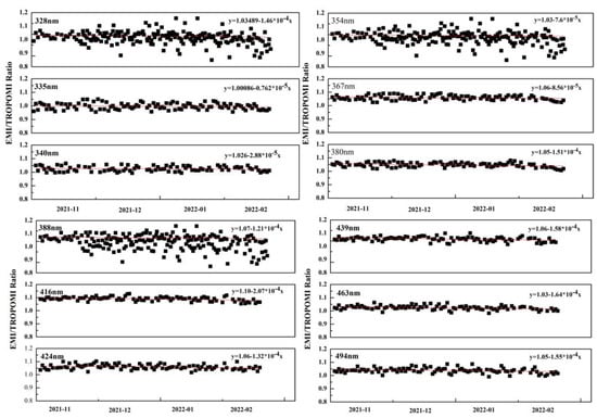 Figure 11 shows the time series of the reflectance ratio of EMI-2 to TROPOMI with different bands (328~494 nm). The reflectance ratios are fitted with a linear function. From November 2021 to February 2022, the time series change of each wavelength band is nearly linear. The largest slope (−2 × 10−4) lies at 416 nm, and the smallest slope (−0.76 × 10−5) is 335 nm. However, both the largest and the smallest are close to 0, which shows that EMI-2 has a strong correlation with TROPOMI in different wavelength bands. In fact, it also shows that the RTM-based correction method can effectively correct the annual periodic change of the reflectance ratio caused by the observed geometric changes. After RTM-based correction, the reflectance ratio is relatively flatter, but the reflectance data still has a certain angular correlation.