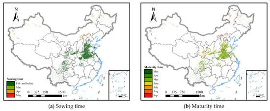 The month of sowing and maturity of wheat in China from 2010 to 2014; (a) sowing time; (b) maturity time.