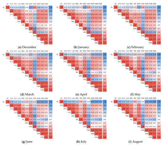 Pearson’s correlation coefficient results for each month of variables from December to August. (a): The monthly variables are the five-year average values of the month from 2009 to 2013. (b–i): The monthly variables are the five-year average values of the month from 2010 to 2014.
