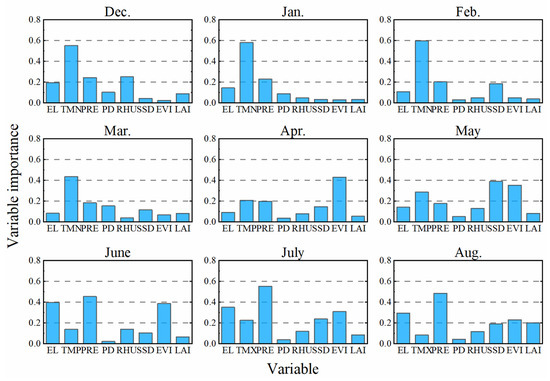 The importance of EVI has obvious seasonal characteristics. From December to March, the importance of EVI was relatively low, with a maximum of 0.07. However, the importance of EVI in April, May, and June were 0.43, 0.35, and 0.39, respectively, and decreased slightly in July and August to 0.31 and 0.23, respectively. The importance value of LAI ranged from 0.03 to 0.08 from December to July and reached the highest value of 0.21 in August.
