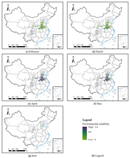 Compared with winter and summer, the suitable areas of stripe rust in spring were the widest. In March, wheat stripe rust was mainly distributed in Southwestern China, the Hanshui Basin, and Southern Henan wheat-growing areas (Figure 5d). Afterwards, stripe rust spread eastward to Henan, Anhui, and Jiangsu and northward to Shandong and Hebei wheat-growing areas. In April, winter wheat began to be harvested from south to north, and stripe rust continued to spread (Figure 5e). By May, stripe rust had become a widespread epidemic in the Guanzhong area, the middle and lower reaches of the Yangtze River, and the Huang-Huai-Hai wheat-planting areas (Figure 5f). The epidemic of stripe rust in northwestern wheat regions lagged behind other regions, and the development was slow in the early stage, but it began to spread rapidly after May.