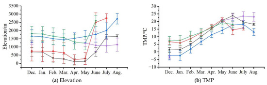 Previous studies have divided the ecological zones of wheat stripe rust in China into 8 regions, as shown in Figure 6 [9]. In order to explore the impact of variables on the environmental suitability of wheat stripe rust in different regions, this study calculated the mean and standard deviation of each variable when the environmental suitability of wheat stripe rust was greater than 0.6 (high potential) in each region [57]. Figure 6 presents the results for each month for the five main regions.
