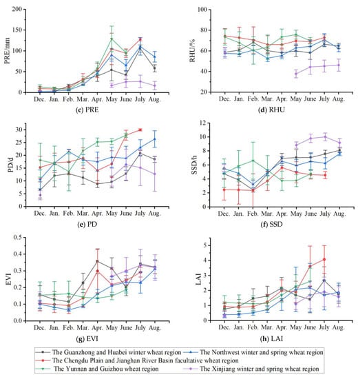In terms of vegetation variables, the variation of EVI values in different regions was different. The EVI of the Yunnan–Guizhou region is relatively stable over time, and the rest of the regions have certain changes over time. Among them, the larger the area of wheat planting, the greater the change of EVI, such as the Chengdu Plain, the Jianghan River Basin, and the Guanzhong and Huabei regions. The average value of EVI in these areas showed a clear trend of first rising and then falling with wheat growth and harvest (Figure 7g). LAI is relatively stable and low in winter, with an average value below 0.40. It started to increase in March in spring, and the changes in different regions were quite different after April (Figure 7h).