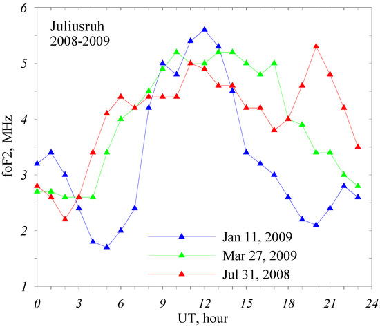 The period from July 2008 to June 2009 which includes the autumnal equinox (September–October) of 2008 and the vernal equinox (March–April) of 2009 was taken for our analysis. That was the deepest solar minimum for the whole history of ionospheric observations with monthly F10.7 = 67.1–69.7 and Ap = 4.4–6.8 nT. Moreover, all days with daily Ap > 7 nT were removed from our analysis. Under such conditions, one may hope to follow seasonal transitions solely related to the intrinsic processes in the thermosphere resulted from solar heating while the effects of auroral heating are supposed to be negligible. The separation of observed diurnal foF2 variations into winter, equinox, and summer was made in accordance with the features also used in our earlier analysis [8]. Figure 1 gives three well-pronounced different types (winter, summer, and equinox) of foF2 diurnal variations observed at Juliusruh in 2008–2009.