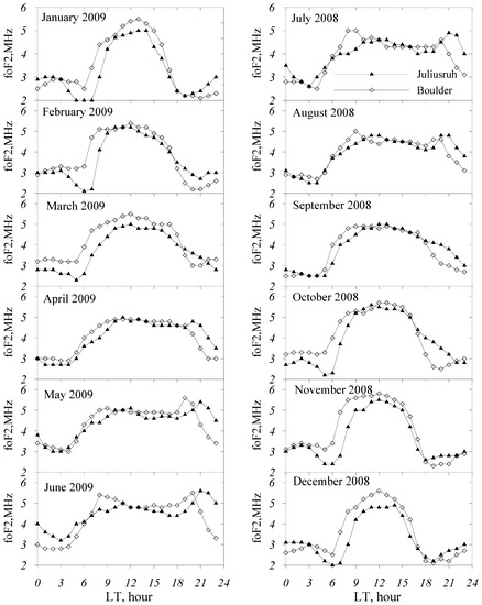 Monthly median foF2 diurnal variations at Juliusruh and Boulder in 2008–2009.