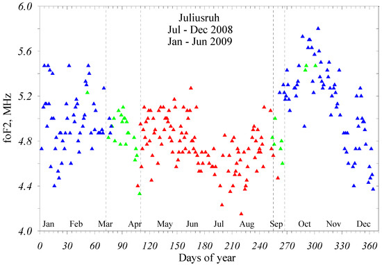 Seasonal distribution of days with three types of foF2 diurnal variation at Juliusruh during July–December 2008 and January–June 2009. Noontime foF2 values are given. Blue triangles—days with winter type of foF2 diurnal variation, red triangles—summer type, and green triangles—equinoctial type. Vertical dashed lines confine the periods of equinoctial transition.
