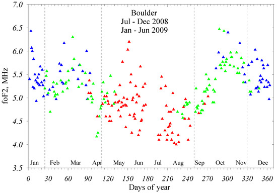 Figure 4 gives same results but for Boulder. The seasonal distribution looks differently compared to Juliusruh. The winter season is much shorter—only ~60 days. The length of vernal transition is hard to estimate as winter and equinoctial types of foF2 diurnal variation are mixed and the total duration of this period is ~85 days. The autumnal transition period is less contaminated with neighboring seasons and its duration is ~80 days. The duration of summer season is similar to the Juliusruh one ~140 days. One may note some interesting results: (i) a short winter season; (ii) a long vernal transition period strongly contaminated with winter days; and (iii) a prolonged autumnal transition period in a comparison with the Juliusruh one. These peculiarities may be related to the Boulder location in the “near pole” longitudinal sector with specific seasonal variations of neutral composition [14,22].